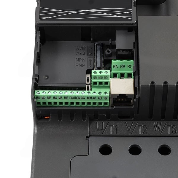 Màn hình hiển thị (tùy chọn)LED 6 phím, 7 đoạn, 4 chữ số, 5 đèn LED trạng thái, hiển thị tần số, dòng điện, đơn vị tùy chọn, giá trị cài đặt, lỗi, RUN, STOP, RESET, FWD/REV, PLC