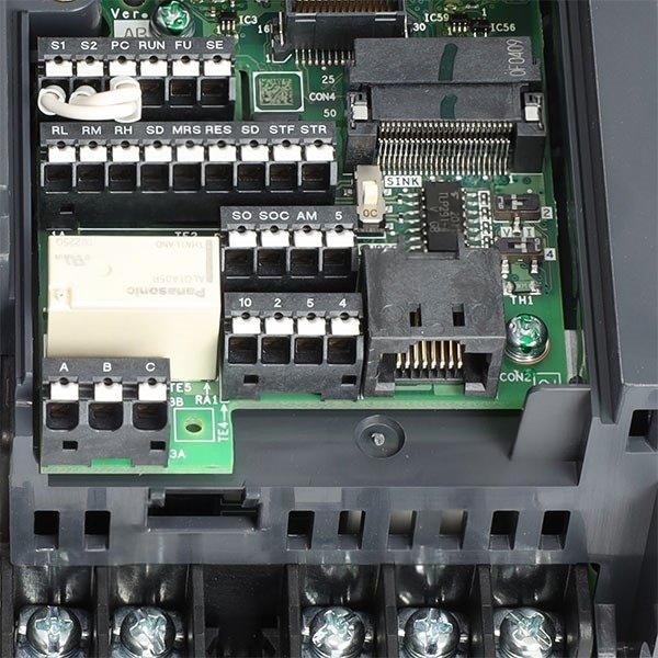 Tín hiệu đầu vào (chuẩn: 7, Ethernet: 2) | Lệnh vận hành tốc độ thấp, trung bình, cao; Lệnh chạy nghịch, lệnh dừng khẩn cấp, reset biến tần Có thể thay đổi chức năng đầu vào từ Pr.178 đến Pr.189 |