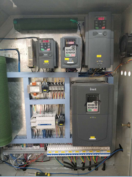 Đối với máy bóc ván lạng này, PLC IVC1L và HMI VS070 của INVT được sử dụng để điều khiển và hiển thị. PLC điều khiển biến tần trục lăn đơn/kép và biến tần cấp liệu qua 3 kênh xung tốc độ cao 50 kHz, đồng thời giao tiếp với HMI và biến tần dao cắt qua Modbus RS485.