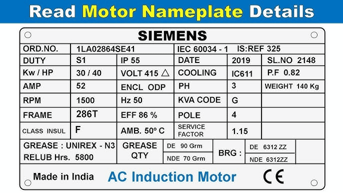 Thông tin quan trọng về động cơ được ghi trên nhãn kim loại gắn với động cơ, bao gồm công suất (HP), tốc độ (RPM), điện áp, dòng điện đầy tải (FLA), và kích thước khung (frame size). Ngoài ra, bạn cần xem xét các yếu tố khác như hiệu suất, kiểu thiết kế, nhiệt độ môi trường và hệ số làm việc (service factor).