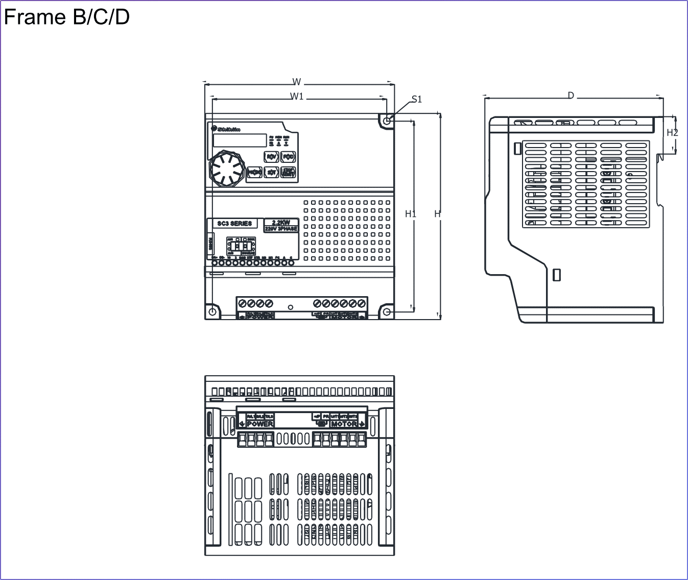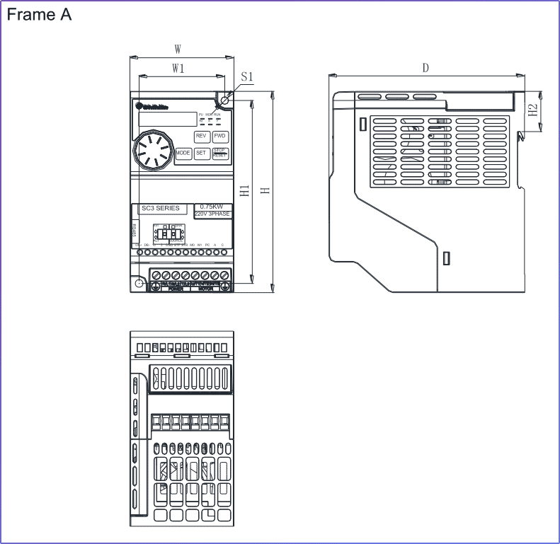 - Kích thước (Dimensions): Các dòng biến tần thường có nhiều kích cỡ (Frame A, B, C, D như SC3) tương ứng với dải công suất khác nhau.